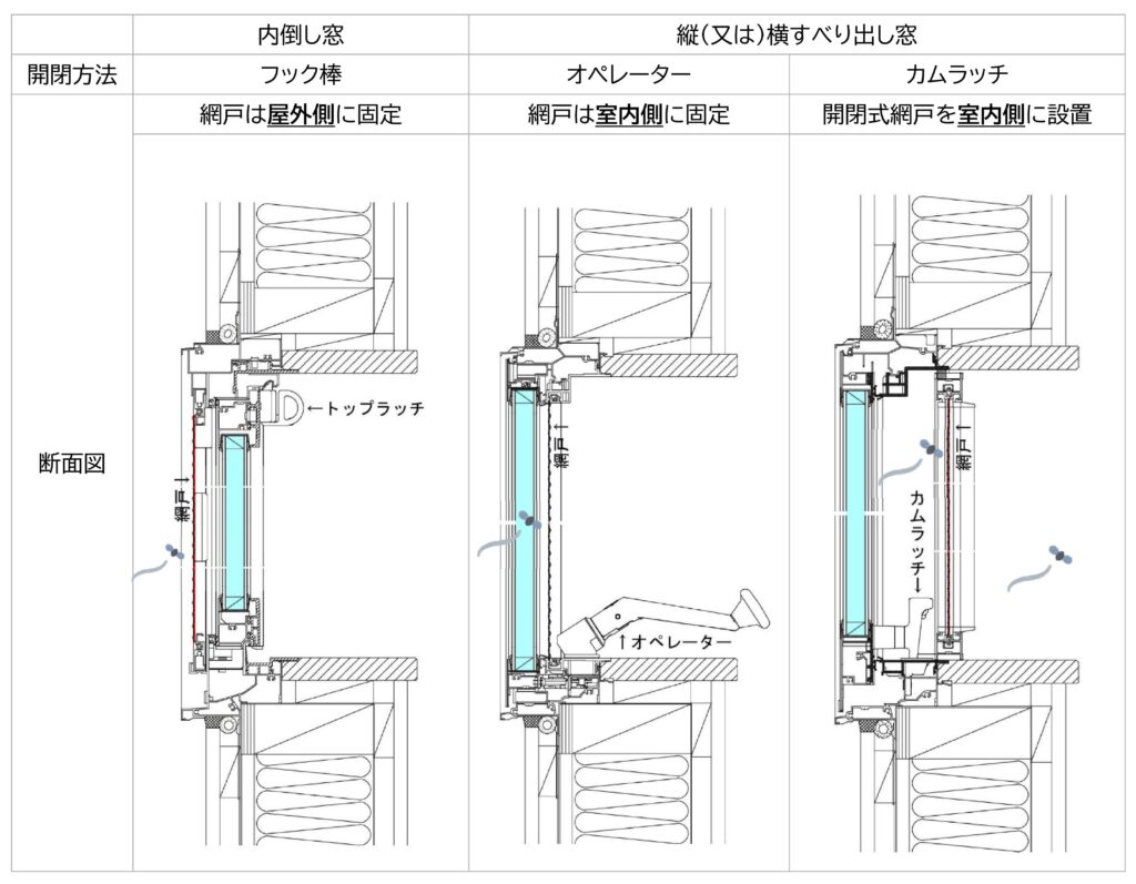 それぞれの窓と網戸の位置関係を、断面図にまとめてみました。