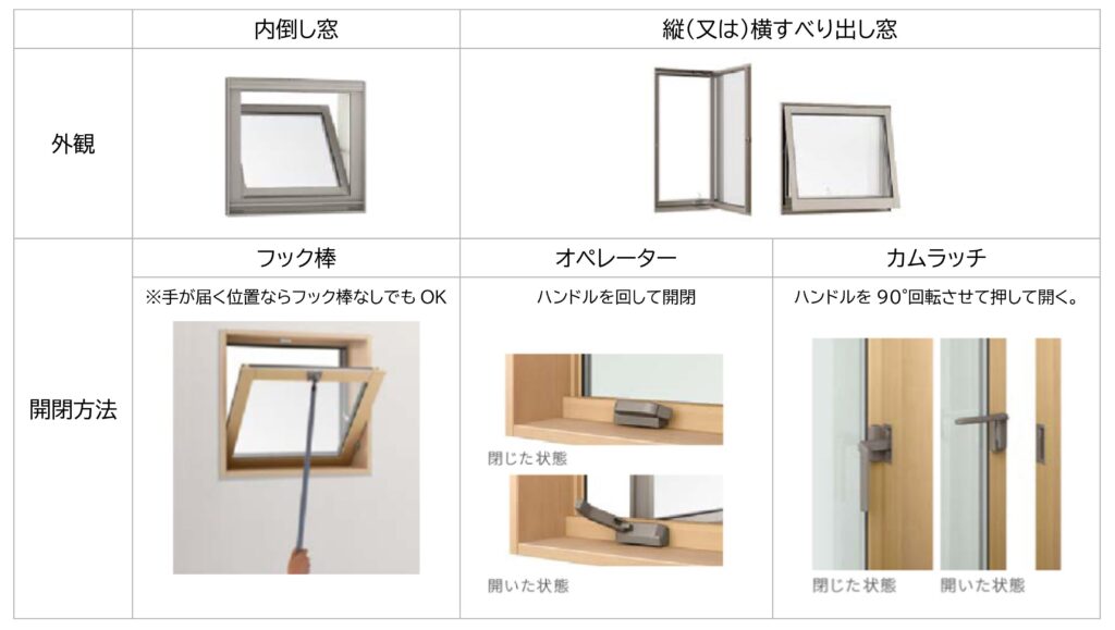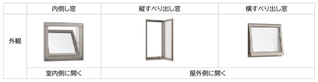 3種類の窓について、屋外からの見た目と開き方を表にまとめてみました。