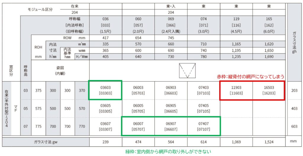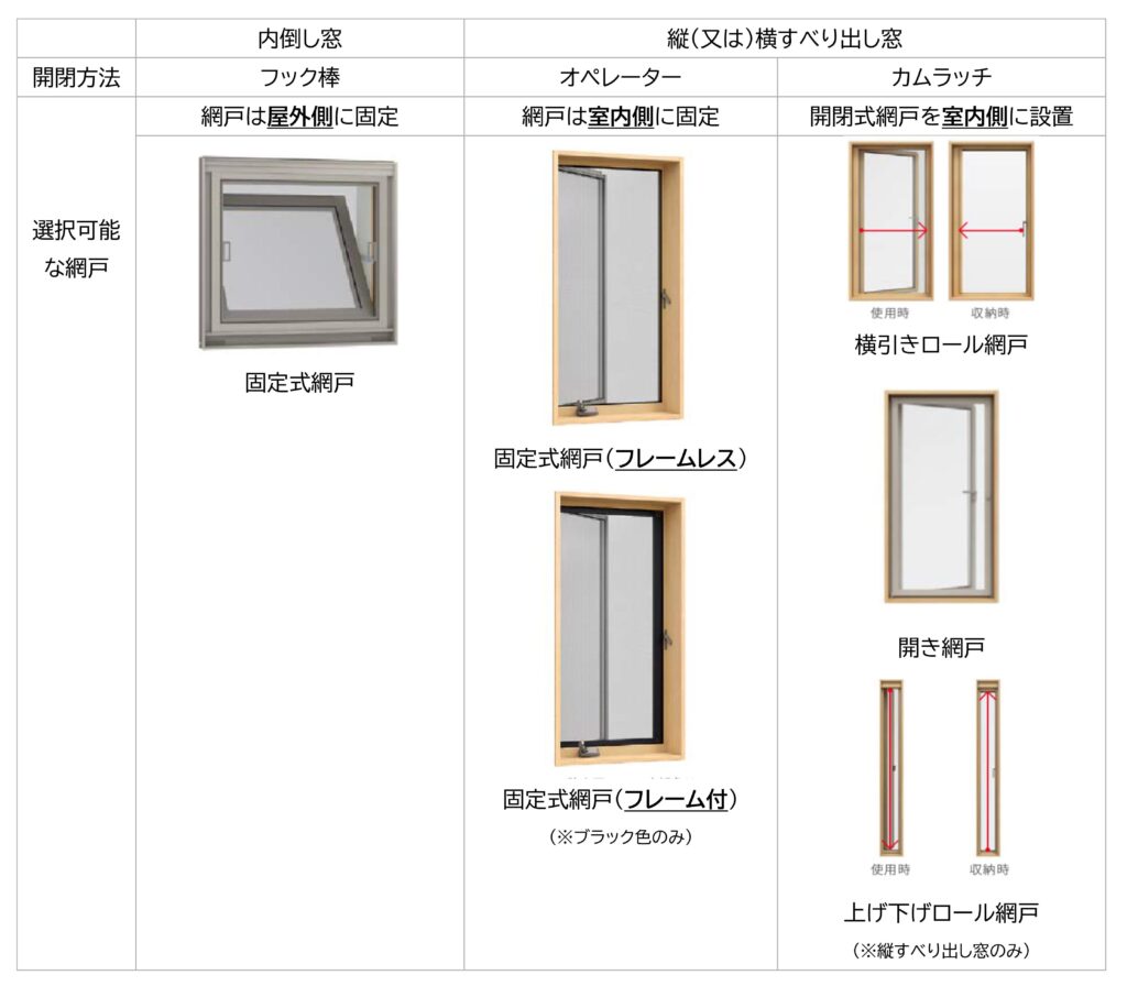それぞれの窓に設置可能な網戸を、表にまとめてみました。