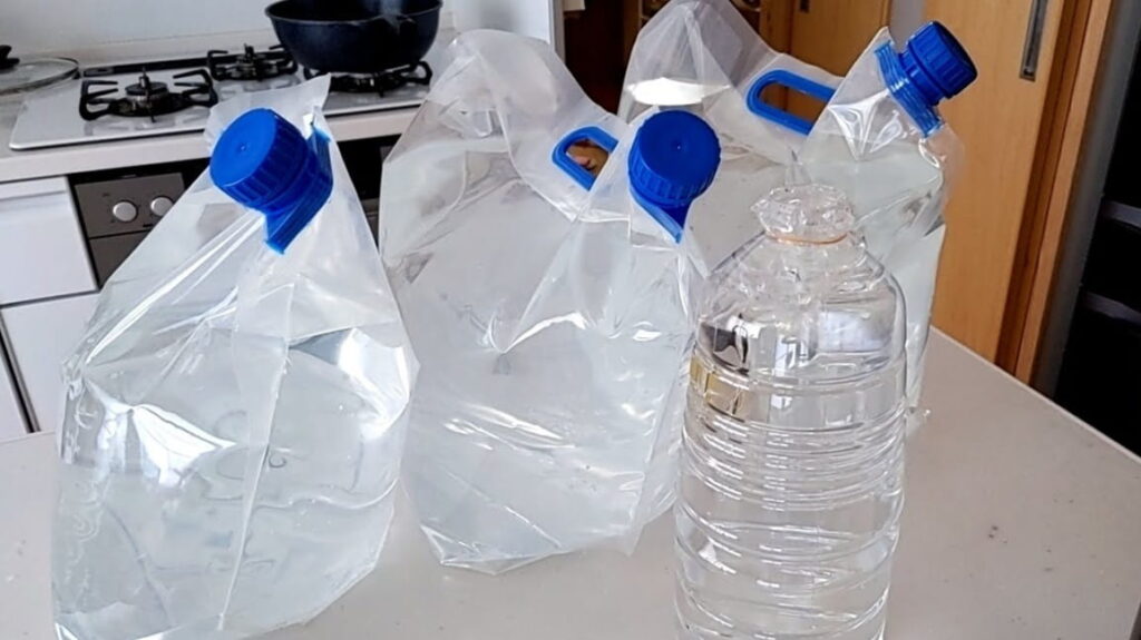 給水バックは、普段コンパクトに収納できる点はよいのですが、しっかりと自立するタンクをストックしていた方がよかったと感じました。