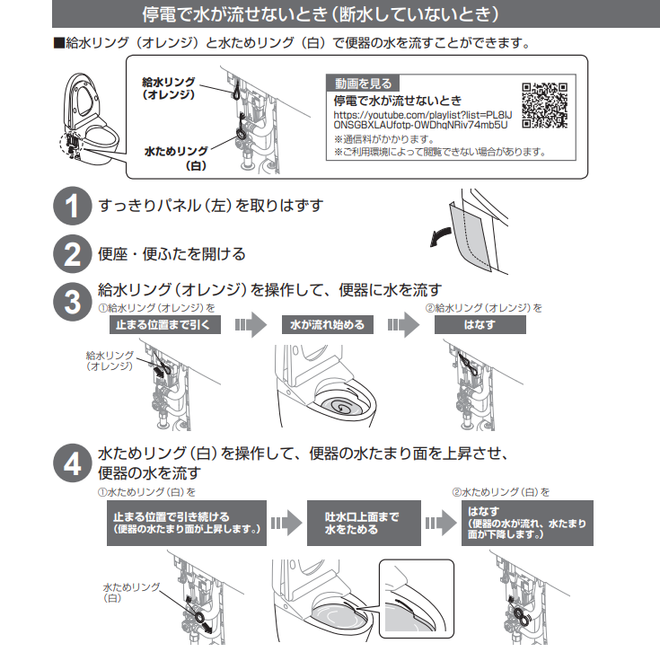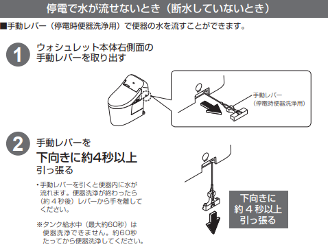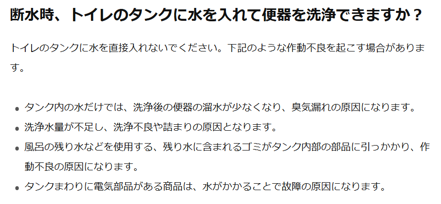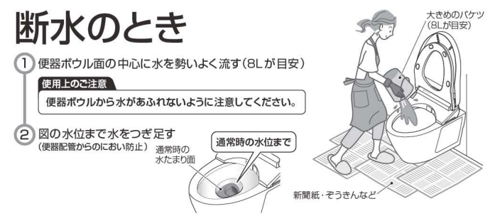 ※あくまでも取扱説明書では「断水時はバケツで水を勢いよく流す」となっていることにご注意ください。