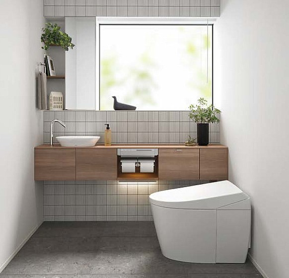 手洗器や収納キャビネットなど、好みの組み合わせができるトイレ。