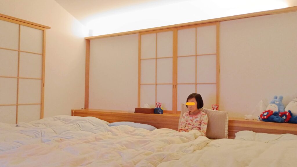 夕食後から寝室の照明をONにしておくことで、いつでも寝室に移動しやすい雰囲気をつくっています。