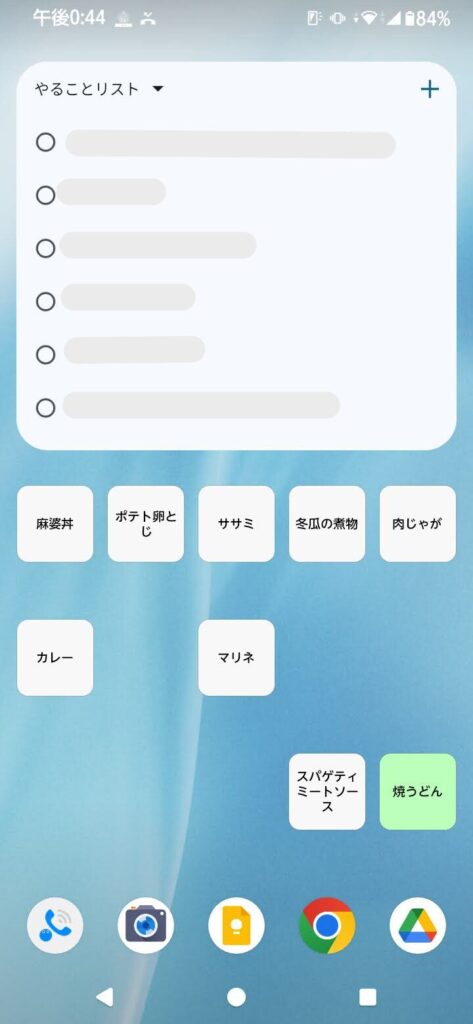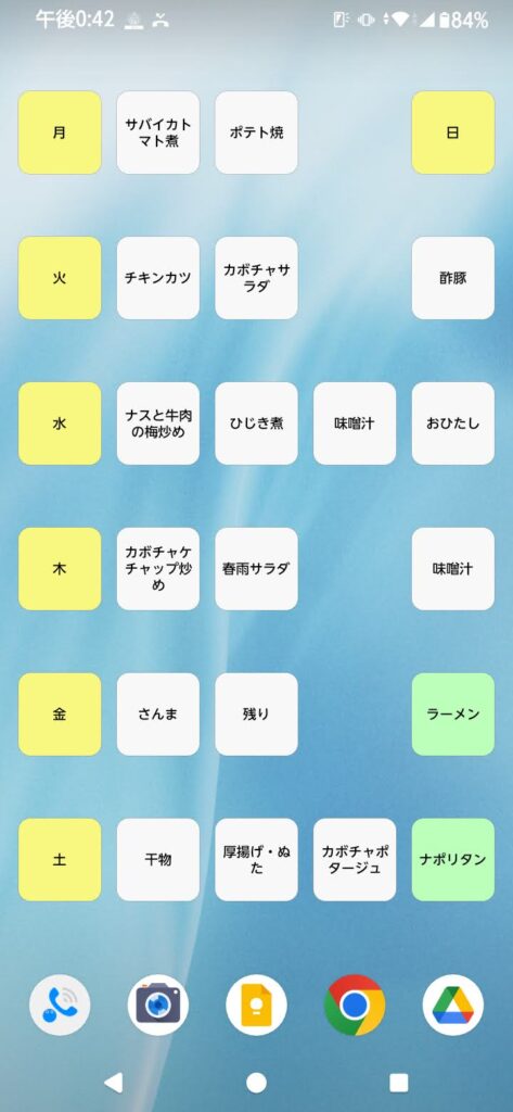 スマホの全画面分を使って、ウィジェットを貼り付けて献立表を作っています。