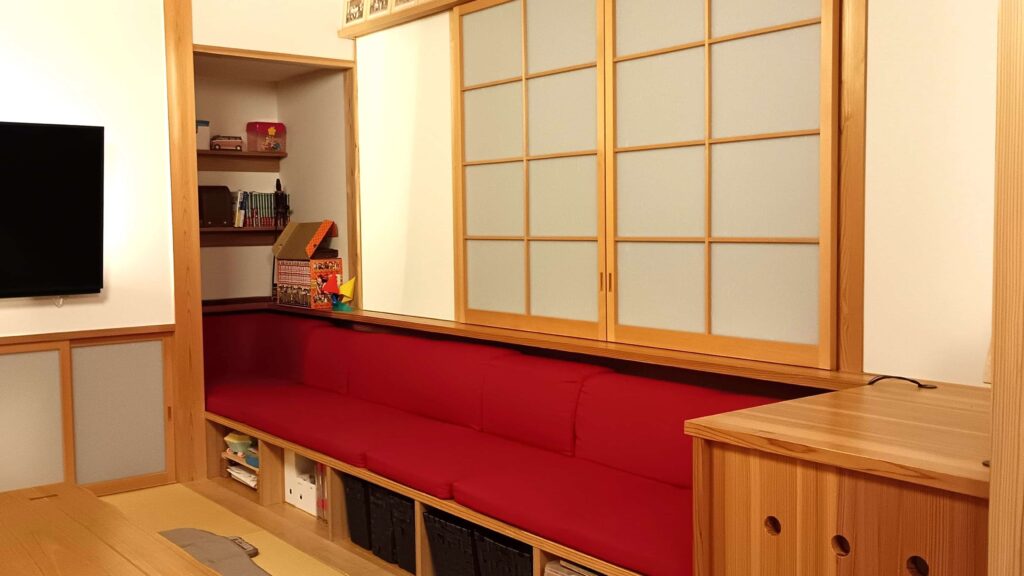 ベンチの下は子供たちの収納スペースとして利用しています。