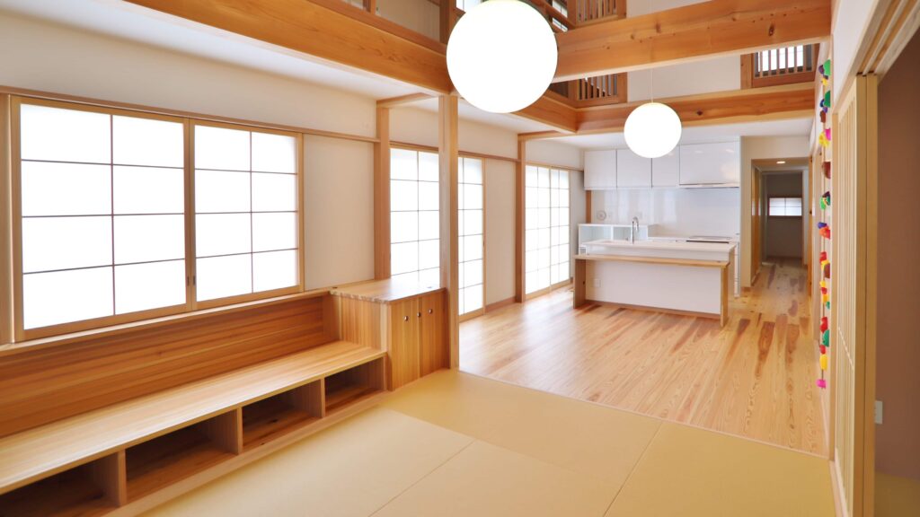 新築時に思い切って、リビング部分の床を全て畳にしました。