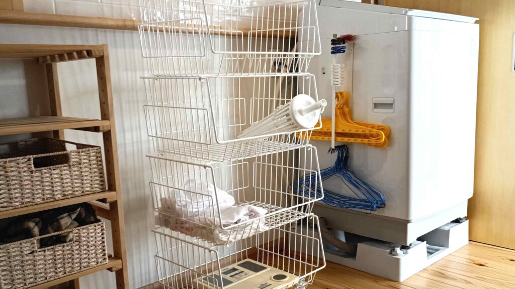業務用カゴは幅広でスペースを取りますが、その分ゆとりがあって、他の物を収納しても洗濯物の邪魔になりません。