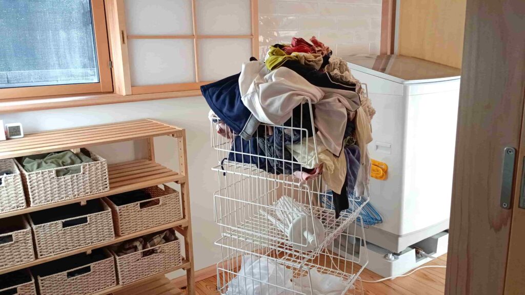 業務用カゴは段数が多く、幅広なので、4人分の洗濯物でも余裕で入ります。