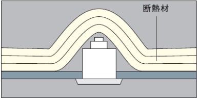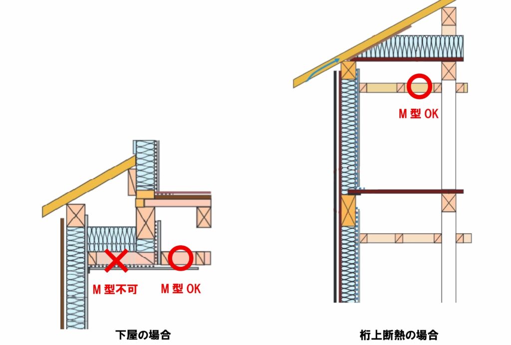 ちなみに上図右側のように、桁上断熱や屋根断熱が施工されている天井であればM型ダウンライトは設置できます。