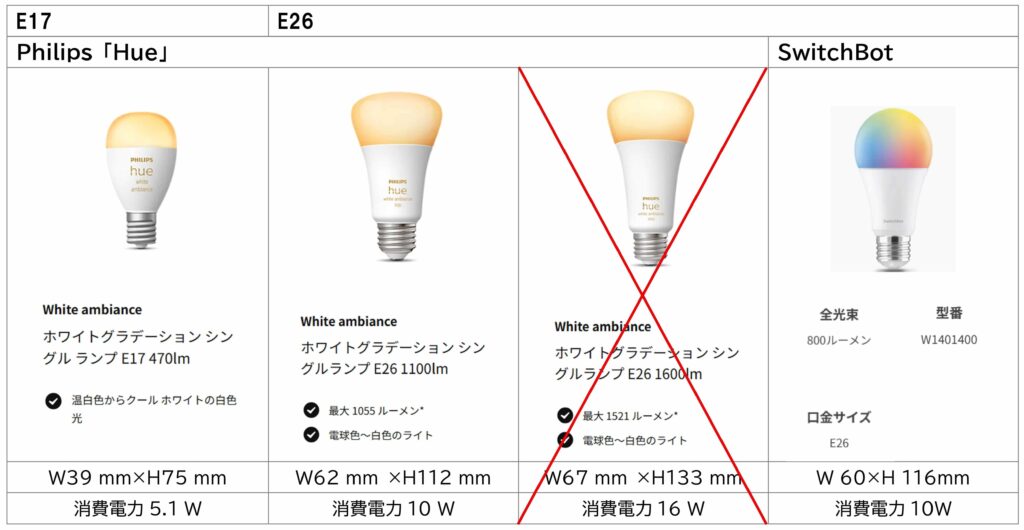 スマート電球で代表的なPhilips「Hue」や「SwitchBot」は現在のところE11電球がないので、解説しませんでした。